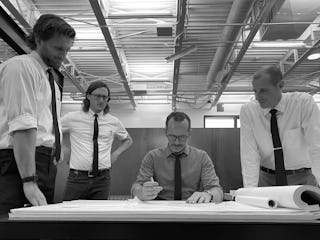 When you imagine an architect, do you immediately picture the stereotypical look from old photos with a room full of people (let's be honest, sadly, it was all men) leaning over their desks with T-squares and triangles? The crisp white shirts, skinny black ties, and thick-rimmed glasses? As architects and designers ourselves, we often picture the more modern icons with their all-black ensembles, like Rem Koolhaas, Zaha Hadid, and Jean Nouvel. But even some of the most well-known architects of our time have their roots in the white shirt and black tie look.
