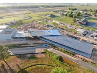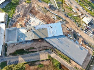 These aerial photos show the current construction progress of England Elementary School's new 57,000 square foot two-story Pre-K and K-6 building. Once completed, it will include general classrooms, a computer lab, cafeteria, self-contained classroom, fine arts, multi-purpose spaces, and other resources. The design responds to the juxtaposition of the city grid and the surrounding natural landscape, with overlapping forms creating an outdoor classroom and covered play area.