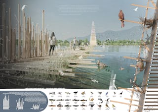 Purposefully unprotected wood dries, warps, and deteriorates through slow decomposition until eventually very little remains. As the lifecycle of the pavilion progresses, the vertical wooden members will deviate from a pristine condition, become aesthetically akin to the landscape, and provide housing for birds taking refuge in its clusters. Insects and reptiles are welcomed by the decay as they find places to burrow. With the passing of time, the native wood will fall apart completely, float away, or sink beneath the water's surface to become a shelter for small fish.
