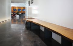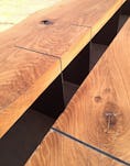 Modus Shop is often asked to fabricate the custom details on Modus Studio projects when a high level of craft is required for proper results. In some cases, this can even include furniture. This pair of benches, designed and fabricated for the lobby of The Cardinal, were built using two book matched slabs of locally sourced oak. Inset flush into the surface of the wood are ¼” blackened steel plate legs in a striated pattern across the length of the benches.