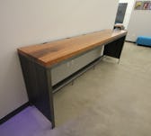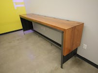 After a successful renovation project by modus studio for the EAST Initiative headquarters, leadership at EAST asked modus shop to design and fabricate a bar-style laptop work table for their Think Space. This table accommodates up to five people at bar height and includes a flush surface power bar with five charging stations. The rich finish of the cherry wood slab contrasts well with the plate steel subsurface, bar stock legs, and stainless steel foot rest.