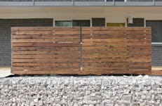As a part of modus studio’s design of Eco Modern Flats, a sustainable multi-family complex renovation, modus shop was chosen to fabricate and erect a series of privacy walls for patios and other spaces around the property. The frames are constructed of painted steel tubes mounted to small concrete footings with anchor plates concealed in the landscape. Cedar boards are applied to the exterior of the frames to provide a cohesive aesthetic that follows the architectural design intent of the complex.