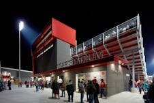 The Green Forest Athletic Complex reshapes the vision of this small public school district’s athletic program with a sleek language of color and form. Located directly to the south of the previously designed modern middle school, the new stands and press box continue the proportions and color coding which are now very identifiable sources of community pride within the Green Forest Public Schools Campus. By establishing a clear processional entry with striking color and form, the pulse of the athletic program is captured in a manner justifiable with the fervor that sporting events demand of small public school realms in the South. This project redefines the athletic + academic edge of the campus and supports the activities that take place on the site, from fundraisers sparked on the under-bleacher terrace to the collective community joining together in support of the home team. The new design sports much-needed service facilities while the enlarged track, new stadium lighting, and re-graded football field elevate the competitive game play and hosting capabilities of the district.